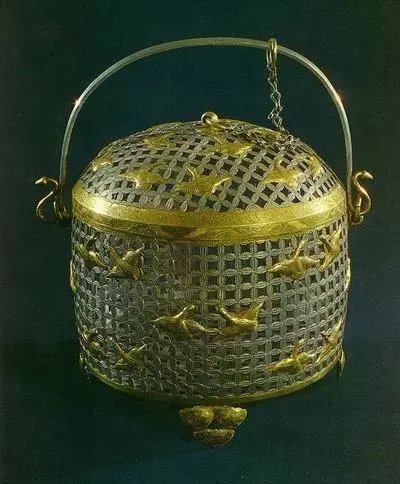 鴻雁球路紋銀籠子,可供作為烘烤餅茶的用器。因唐時(shí),人們飲的是餅茶,飲茶時(shí)要將餅茶先進(jìn)行烘烤后,再經(jīng)碾碎,方可煮茶飲用。