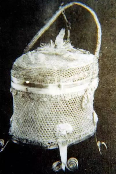 通高15.0厘米,全重335克。有蓋,直口,深腹,平底,四足。蓋為穹頂,籠有提梁,蓋與提梁間有鏈相連。整個(gè)籠子用極細(xì)的金銀絲編織而成。