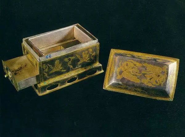 通高9.5厘米,羅身長13.4厘米,寬8.4厘米。屜長12.7厘米,寬7.5厘米,高2.0厘米。座長14.9厘米,寬8.9厘米,高2.0厘米,全重1472克。通體呈長方形,由蓋、羅、屜、羅架、器座組成,均系鈑金成型,紋飾涂金。蓋頂鏨兩體首尾相對(duì)的飛天,并襯以流云。蓋剎四周各飾一和合云。羅架兩側(cè)飾執(zhí)幡駕鶴仙人,另兩側(cè)為相對(duì)飛翔的仙鶴,四周飾蓮瓣紋。羅和屜均為匣狀,中夾羅網(wǎng),屜面飾流云紋,有拉手。羅架下有臺(tái)形座器,設(shè)鏤空壺門。