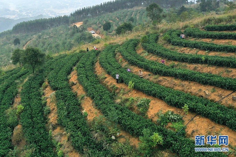 無(wú)人機(jī)航拍農(nóng)戶們?cè)诓枞~種植扶貧示范園給茶樹除草。 劉君攝