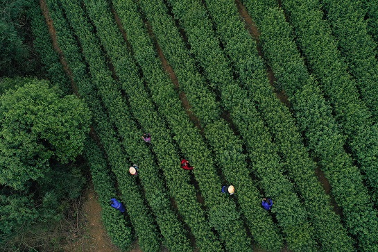 3月20日,采茶工在余杭區(qū)余杭街道竹園村的茶園采摘茶葉(無人機(jī)照片)。