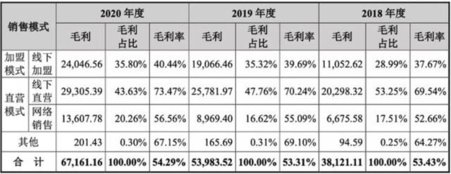 從銷售模式來看,八馬茶業(yè)采取的是“直營+加盟”、“線上+線下”的全渠道銷售體系。截至2020年末,公司門店數(shù)量超過2000家,其中直營店366家,加盟店超1700家。雖然,加盟店數(shù)量遠超直營店數(shù)量,但由于線下加盟模式的毛利率只有40%,遠低于線下直營模式73%的毛利率。因此,366家直營店貢獻的毛利與超過1700家加盟店貢獻的利潤大體相當(dāng)。