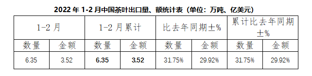 據(jù)中國海關(guān)數(shù)據(jù),2022年1-2月,中國茶葉出口量為6.35萬噸,同比增長31.75%,出口額為3.52億美元,同比增長29.92%,1-2月出口均價(jià)為5.54美元/千克,比去年同期微降1.39%。